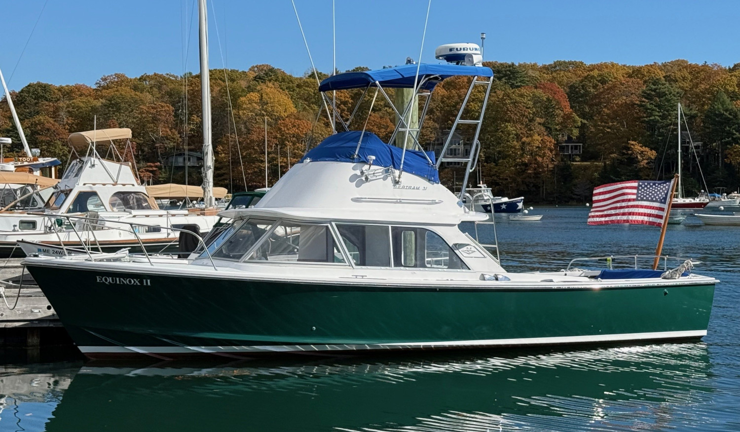 Classic Bertram 31 Flybridge Cruiser with low-hour 2011 diesels, updated electronics, Awlgrip topsides, and exceptional Maine yard maintenance.