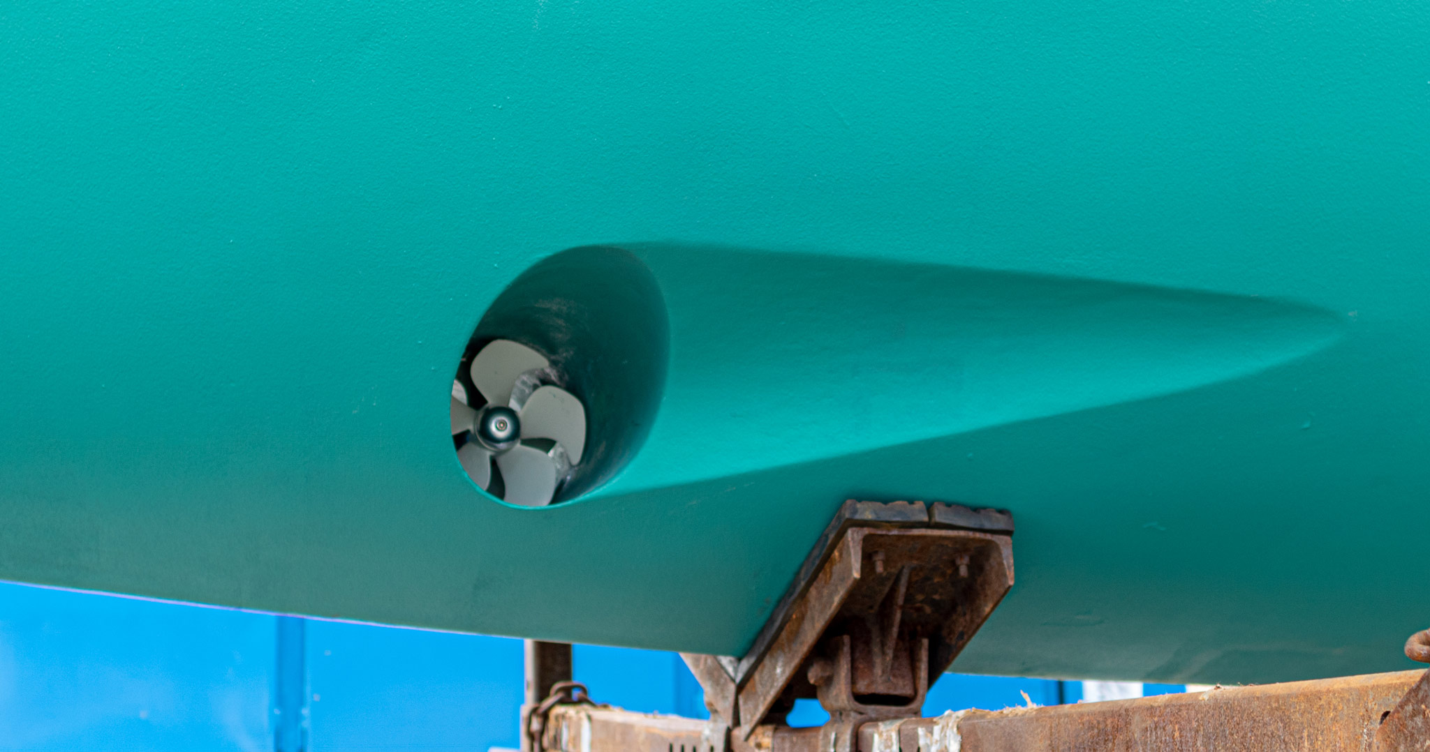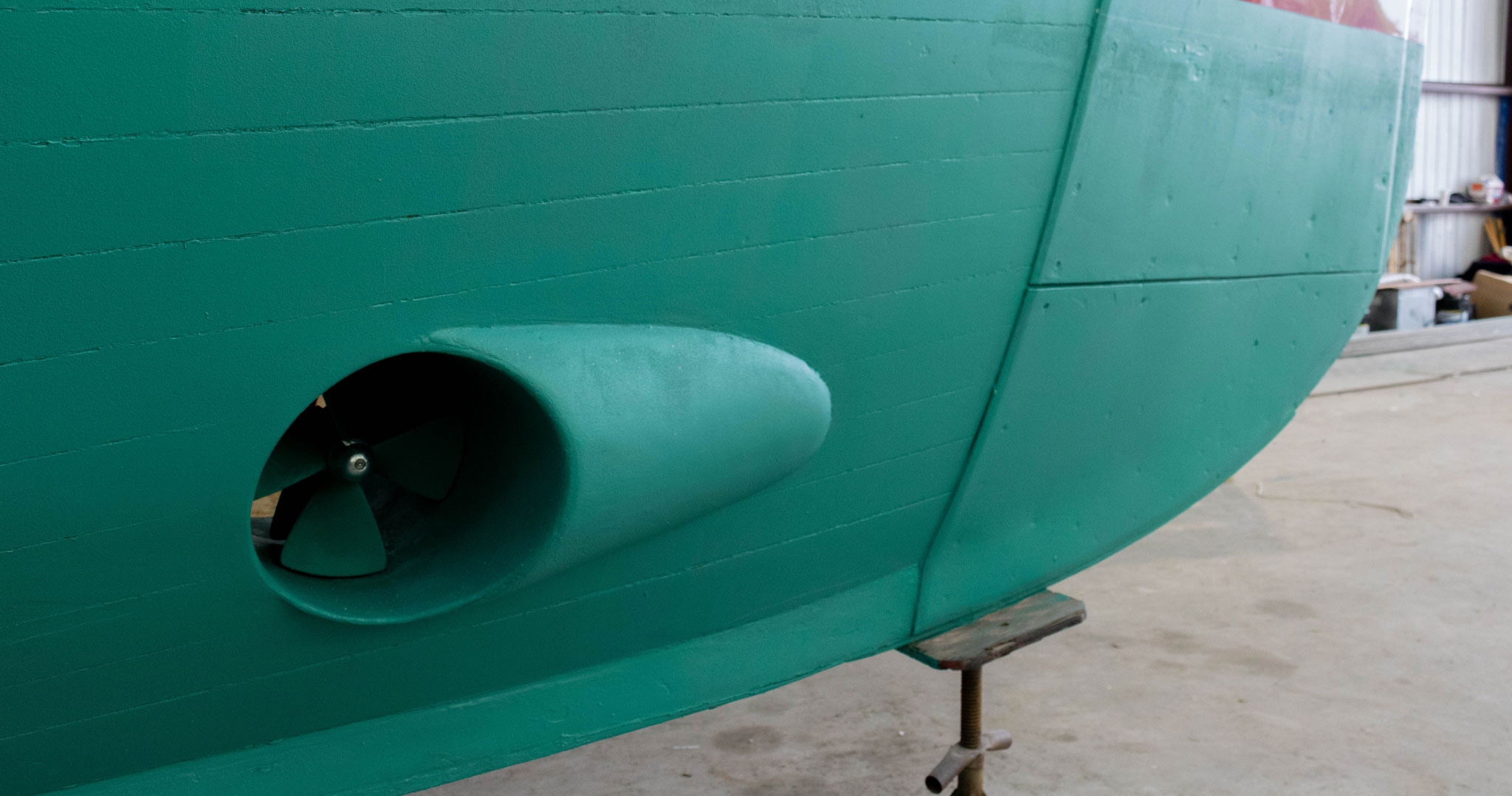 Joy balanced these factors against the center of the boat’s windage — or ‘lateral wind draft area’ — to find the thruster position that maximized its turning moment. Gone With The Wind’s thruster was placed just aft enough of the bow to allow for a 12-inch tunnel depth. That single tube diameter depth prevents air or sea foam from getting ingested into the unit.