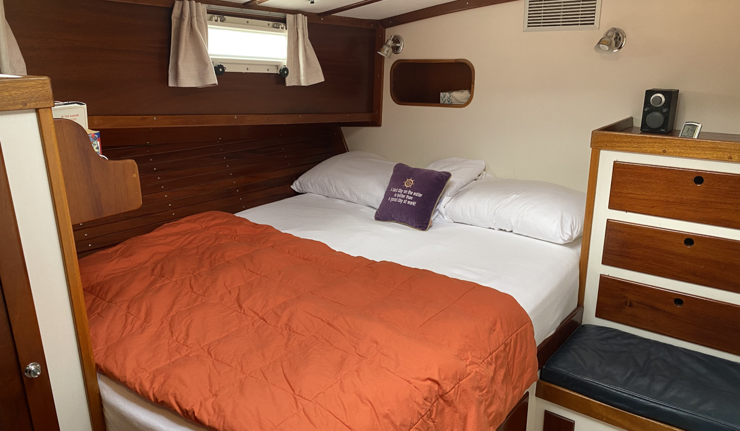Across from the galley the port owners’ cabin with plenty of storage and a comfortable custom queen berth, along with a convenient seat inboard of the berth.