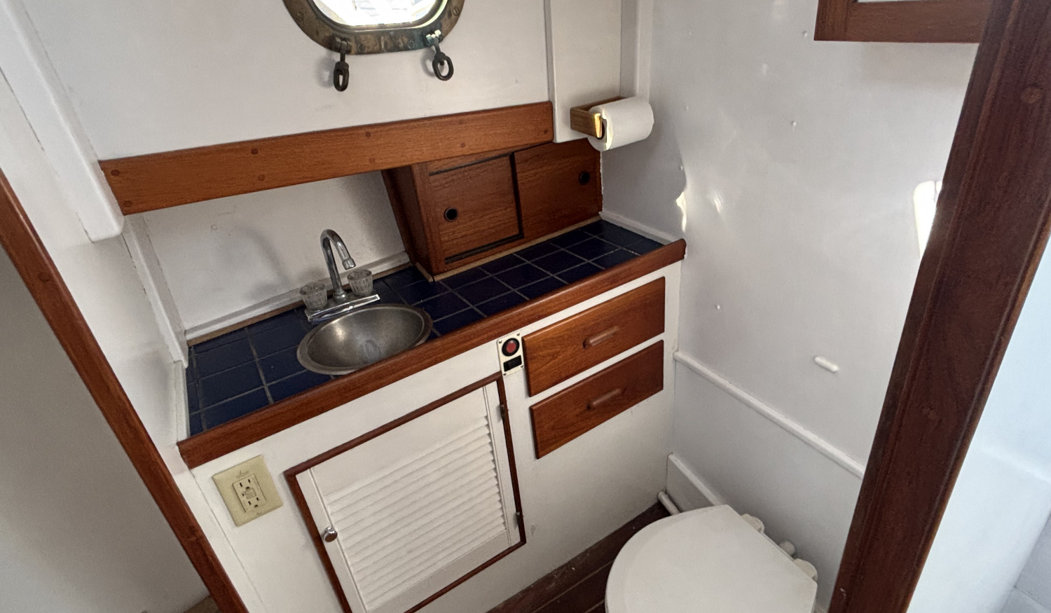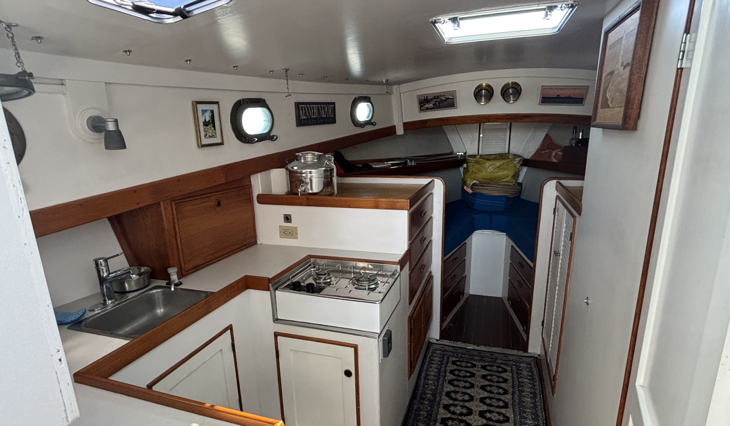 Her helm is well equipped with modern Simrad electronics, and safety is enhanced by a new ACR GlobalFix EPIRB. Below deck, the inviting Herreshoff-style interior is bright and airy, featuring six opening bronze ports for excellent ventilation. The low-mounted V-berth provides comfortable access, and the layout makes smart use of space for extended weekends aboard.