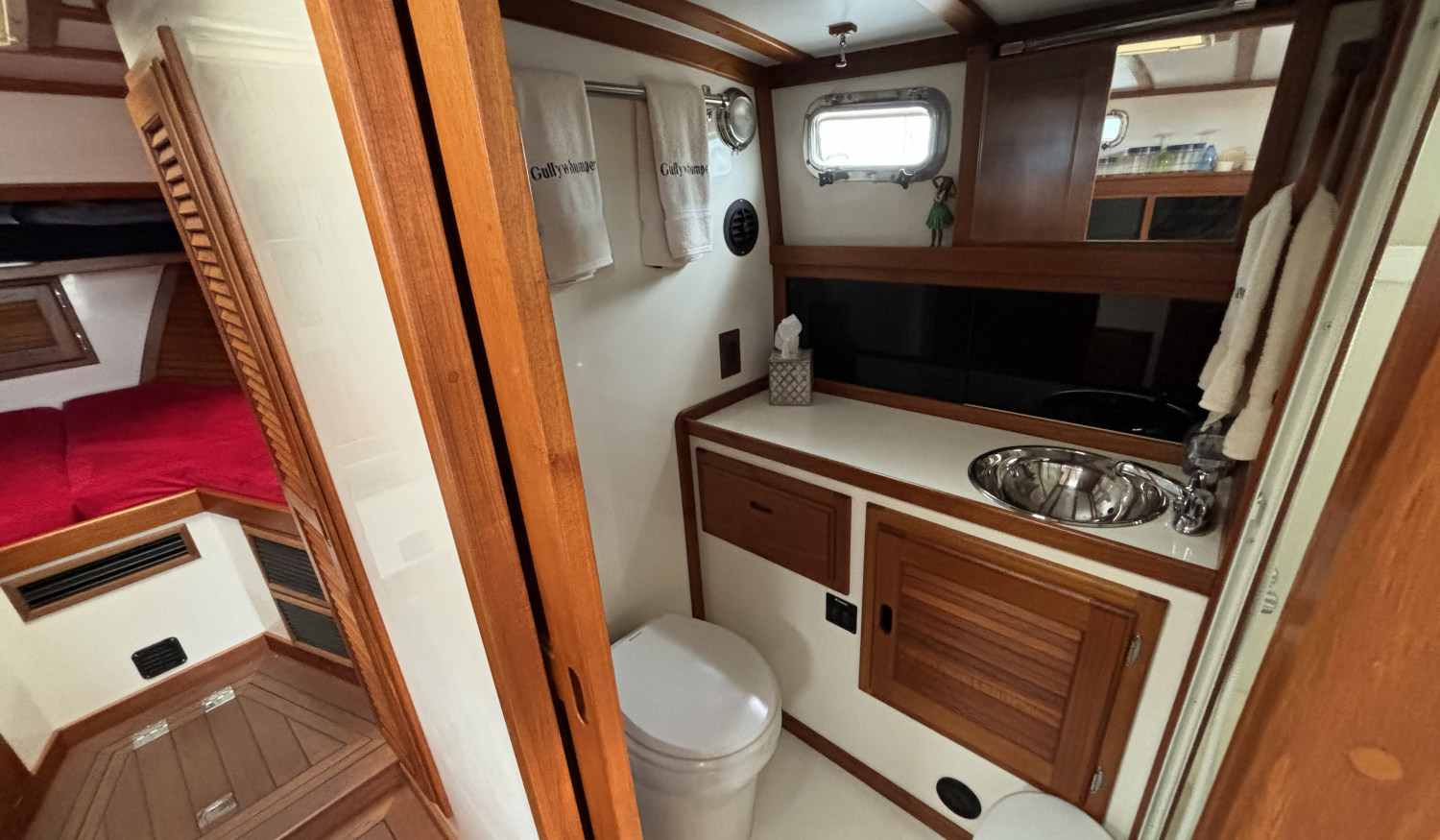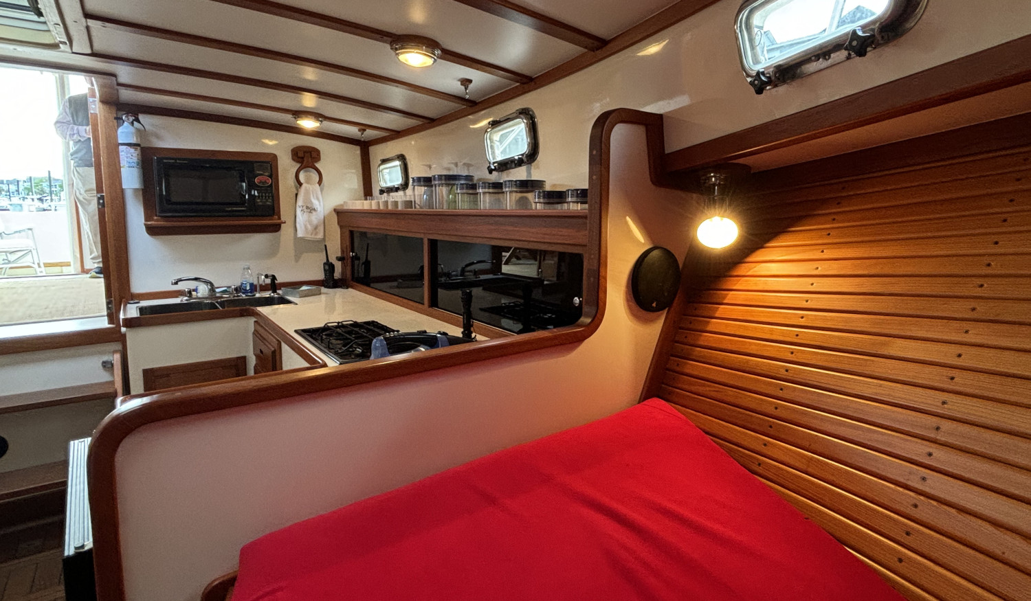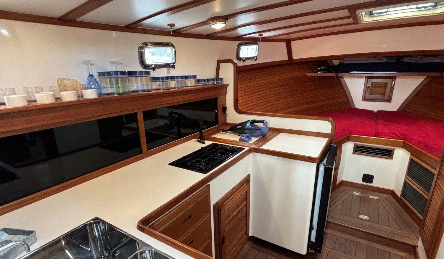 Below, her accommodations reflect the warmth and practicality Ellis is known for. The spacious galley includes a propane stove with oven, generous under-counter refrigeration, double stainless sinks, and custom cabinetry for smart storage. Opposite the galley is a large head with a separate shower stall. Forward, the roomy V-berth offers plenty of built-in storage, making extended cruising comfortable and efficient.