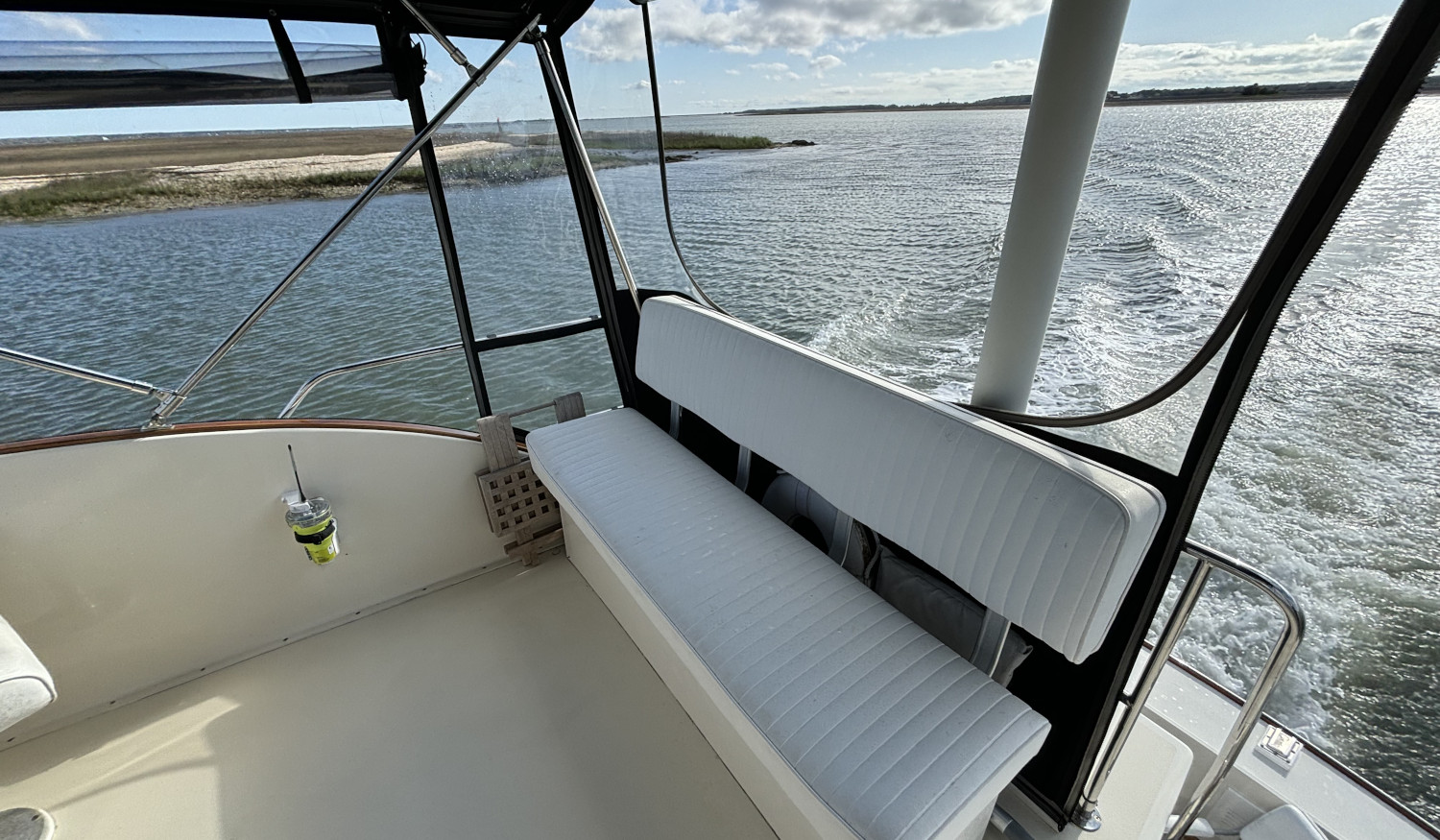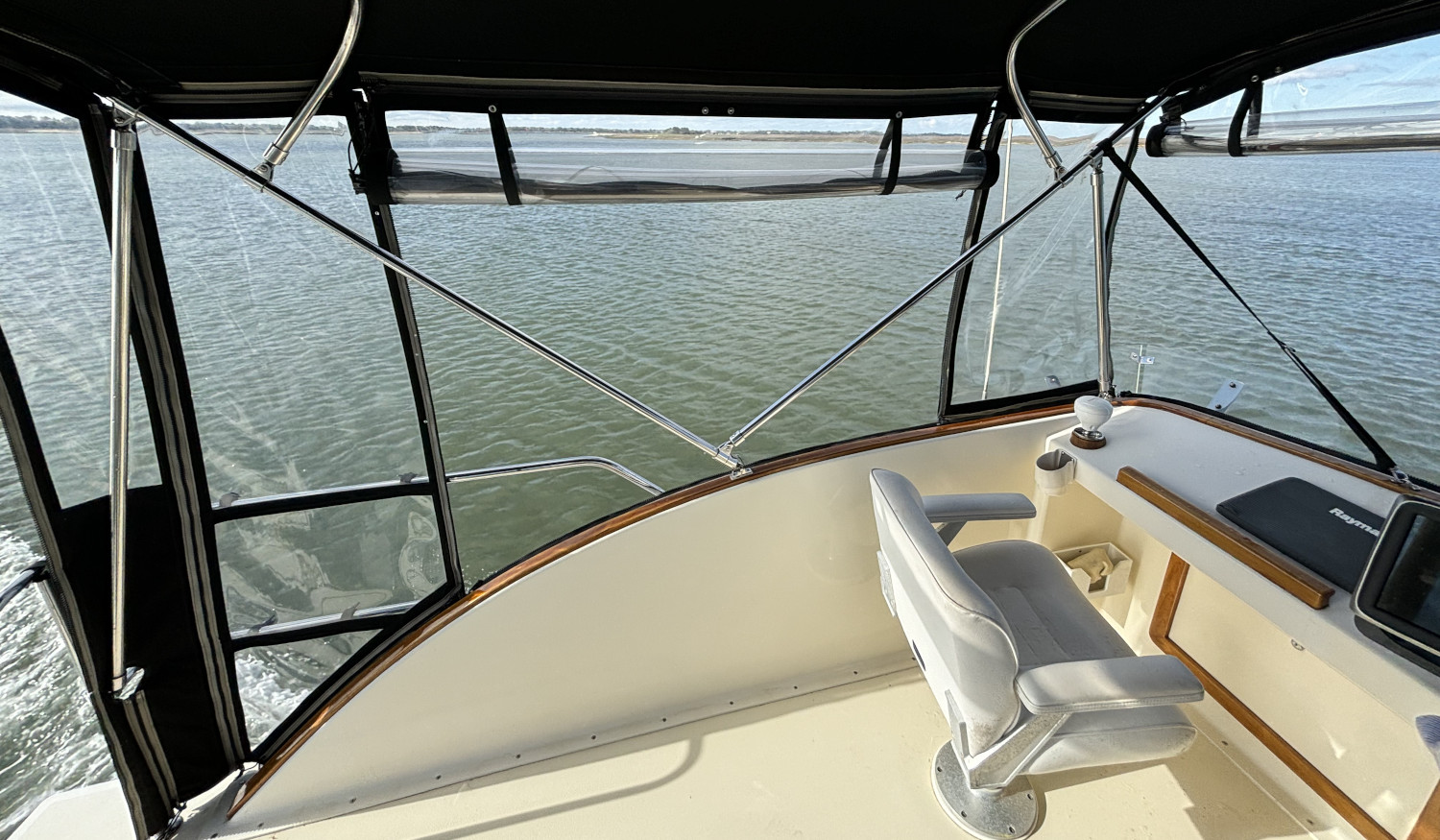 The deckhouse features a comfortable L-shaped settee, wide helm and companion seats mounted on Ellis’s signature hydraulic bases, and space for additional deck chairs—perfect for entertaining or simply enjoying the view. A half-height aft bulkhead, enclosed with canvas and isinglass, offers protection while preserving an open, airy feel.