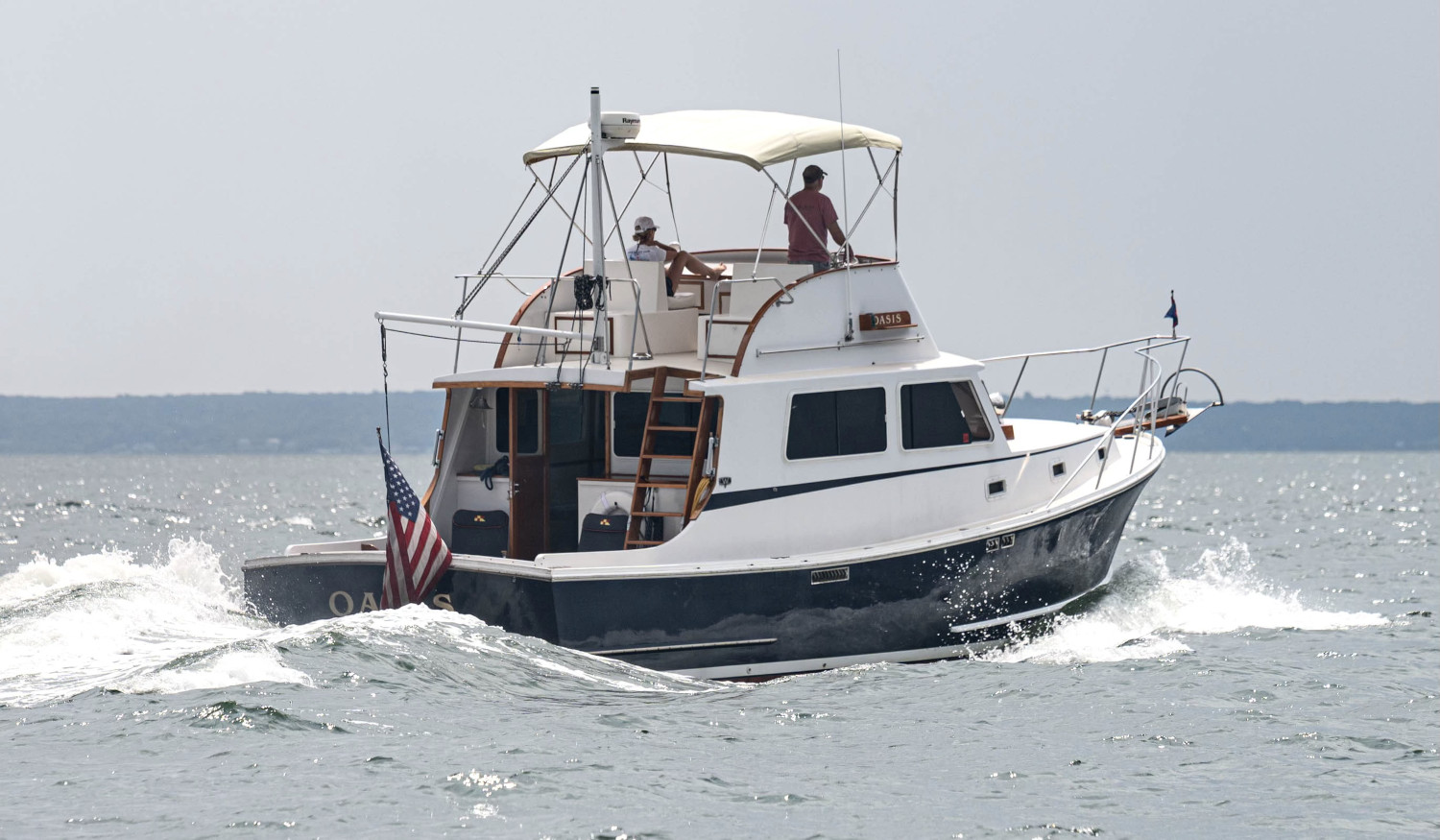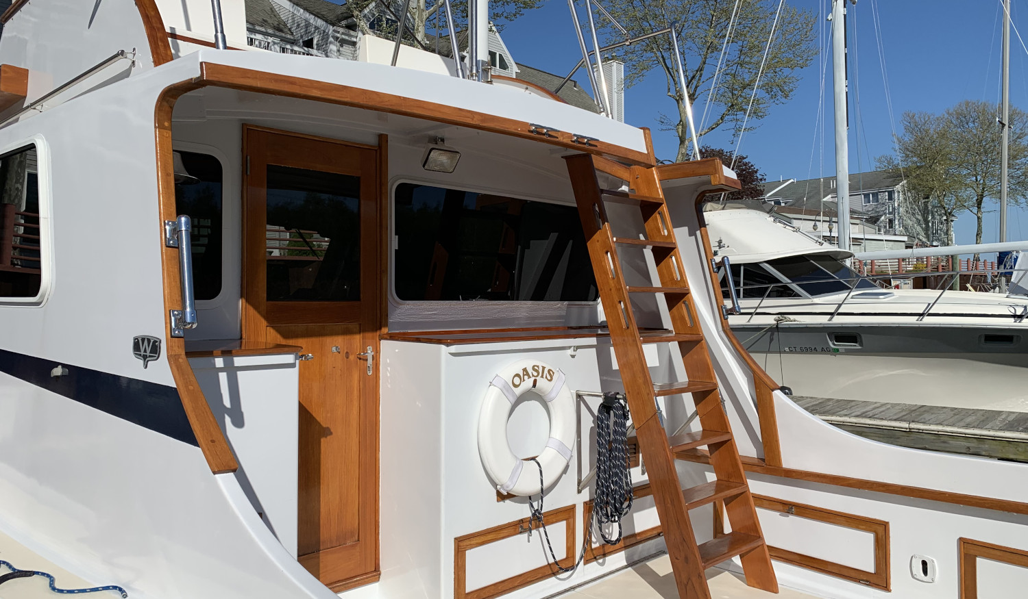 Oasis is a stunning example of the Wilbur 38 Flybridge Cruiser, one of the most respected Downeast designs to come out of Maine. Built in Southwest Harbor by Lee S. Wilbur & Co., this vessel combines the timeless lines and craftsmanship of a traditional Maine lobster yacht with the comfort and performance of a capable coastal cruiser. Known for their solid fiberglass construction, quiet running, and seaworthy design, Wilburs have long been favored by yachtsmen who value both elegance and integrity.