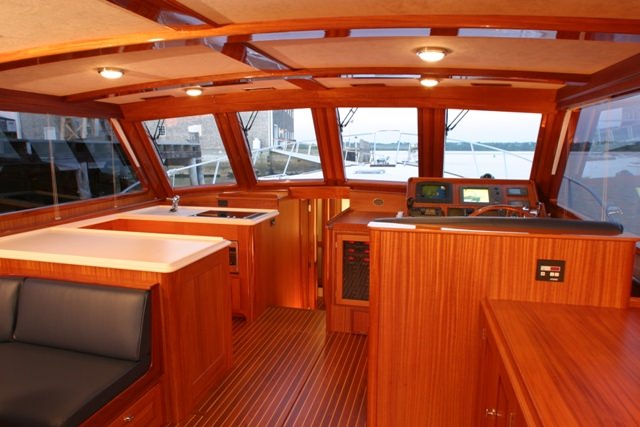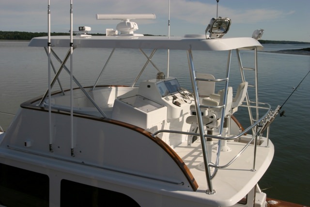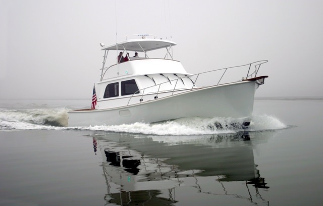We launched and sea trialed the 50′ KOAN the summer of 2003 and found her to run well at 20 knots loaded with all the luxuries. The great visibility from the upper helm station and the comfortable lounge area forward of the helm make for a great place to relax on a summer’s day. We finished off this custom sportfishing machine with a traditional Herreshoff styled interior full of mahogany and Corian(R) counters that add to the warm feel below. The lower cabins have the classic look with warm, off-white panels trimmed in teak. The raised galley and main salon are primarily mahogany with large windows that provide a light and open feeling. Powered by a single 1500 hp Caterpillar 3412 diesel and a 32 kw Westerbeke generator, she is a great running boat that handles a seaway kindly. KOAN is equipped with a full array of electronics for serious fishing as well as two large fish holds with ice makers. Her exterior shows off her sportfishing heart. Making those runs out to the canyons will be smooth and comfortable with lots of room for exciting offshore hunting.