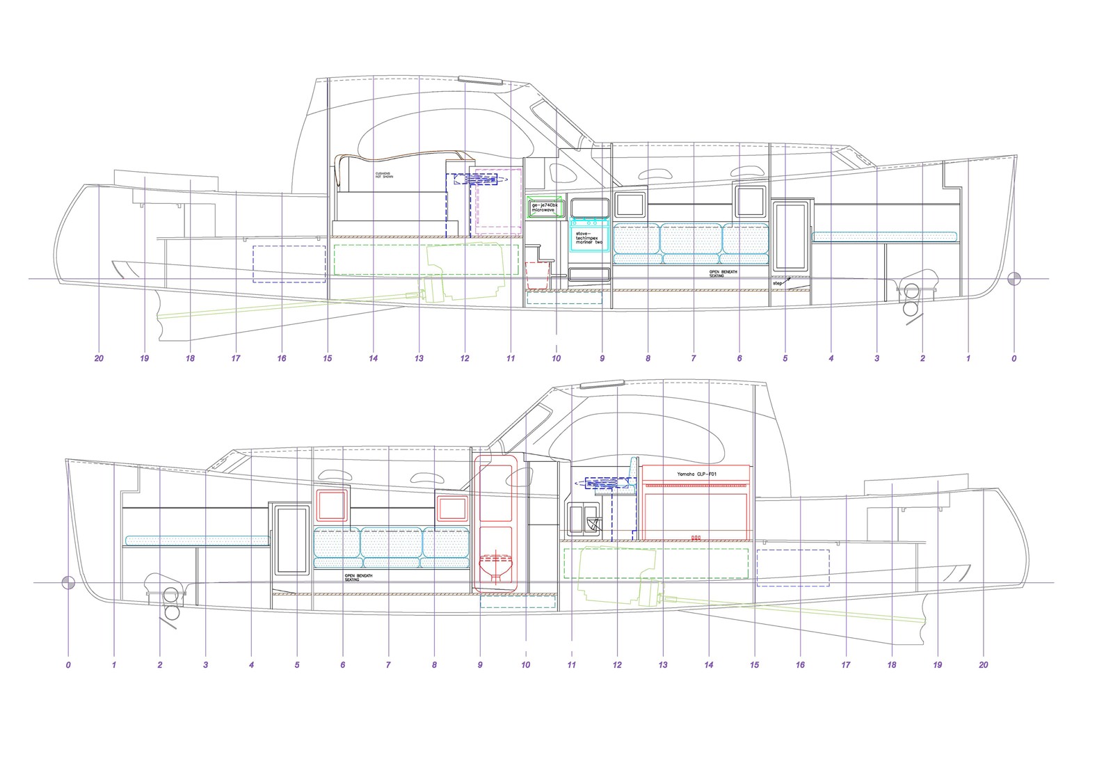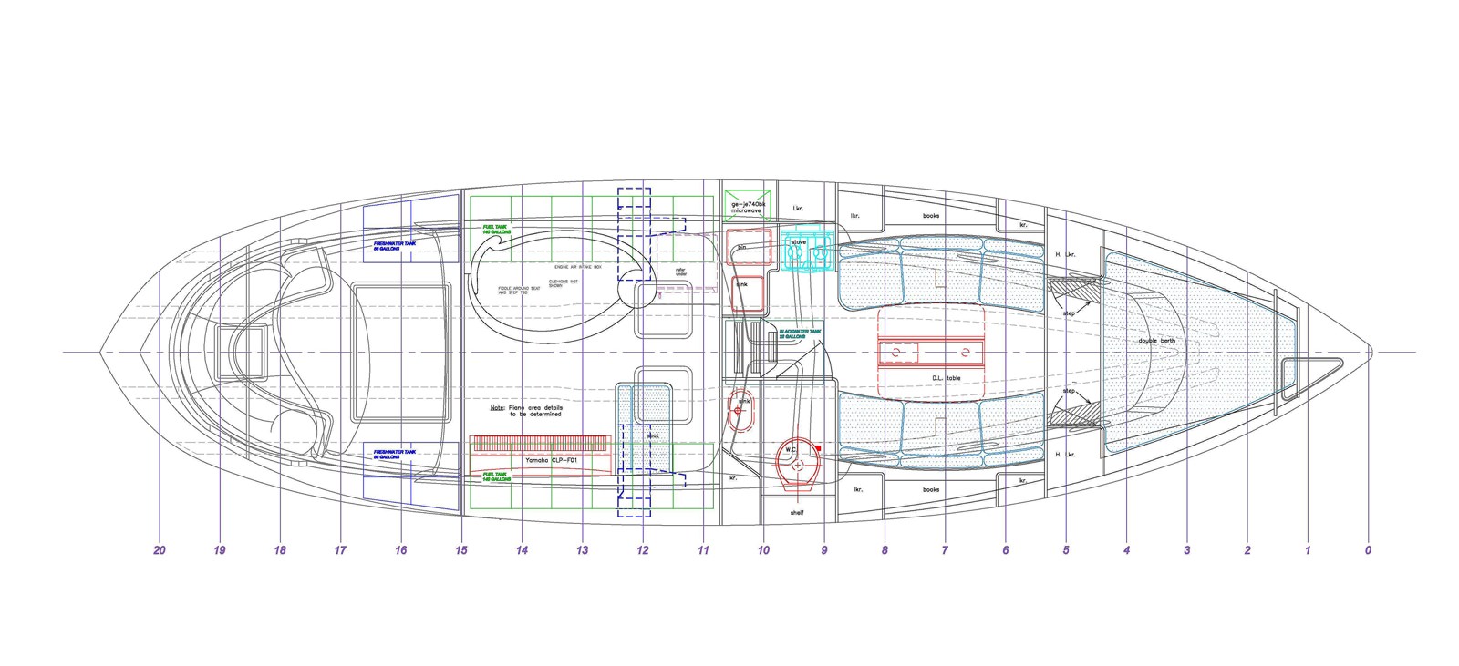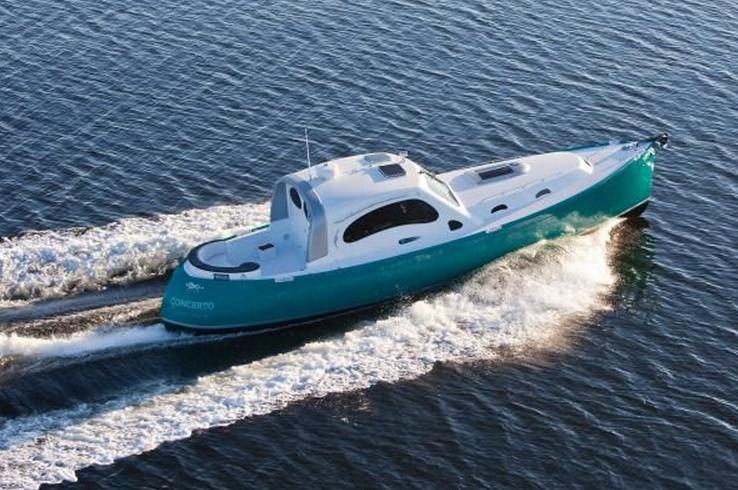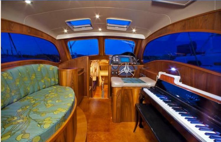 Ken Sawyer has worked with us now for several years. The initial projects were large refits: first a Tashiba 40 and then one of our Seguin 46’s. The success of both projects led us to build FAIRWEATHER, the first in our latest Seguin Series. Along the way, we also worked on Ken’s houses to develop and illustrate his Yarchitecture designs. Yarchitecture is Ken’s term for his design philosophies he is incorporating into his home. We built his concepts into his houses (both on Kiawah Island, South Carolina and in Cushing, Maine), so he can showcase and sell his yarchitecture to others. This newest project — LIONHEART CONCERTO – brings another member to the team: a Yamaha Piano. Featured in this beautiful Bob Perry designed 42 is a full-sounding Yamaha piano which will be tied into the boat’s sound system for the total music package. How many boats of 42′ feature a Yamaha piano? The hull is extremely efficient and is powered using only a single 225hp conventional drive system.