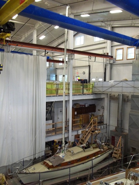 While she did have an engine, time had taken its toll, requiring that it be rebuilt.  Lyman-Morse also installed the systems.  We installed the galley, and shelving in the forward berth.  We installed a portion of the cabin sole and completed the companionway.  We built the centerboard and she received a new Selden carbon fiber mast.  She received new varnish, her name and hail were refinished, and she made her debut at the Rockland Maine Boats, Homes and Harbors Show in August 2012