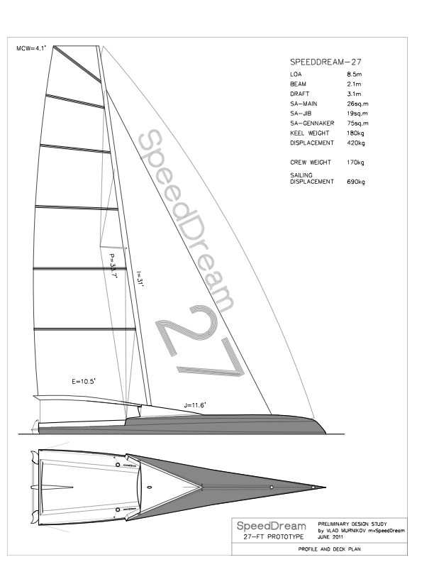 Stabilizing foils to further improve stability and reduce drag by partially offsetting boat weight. Similar to theDSS foils pioneered by Hugh Welbourn, SpeedDream wings are used in combination with canting keel and, in addition to lift, provide lateral resistance.