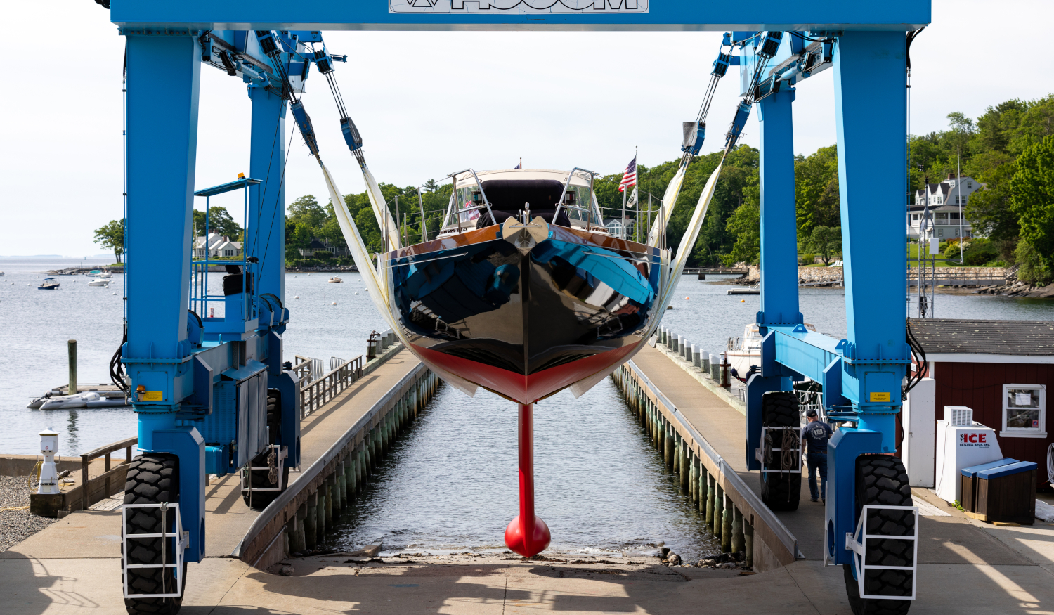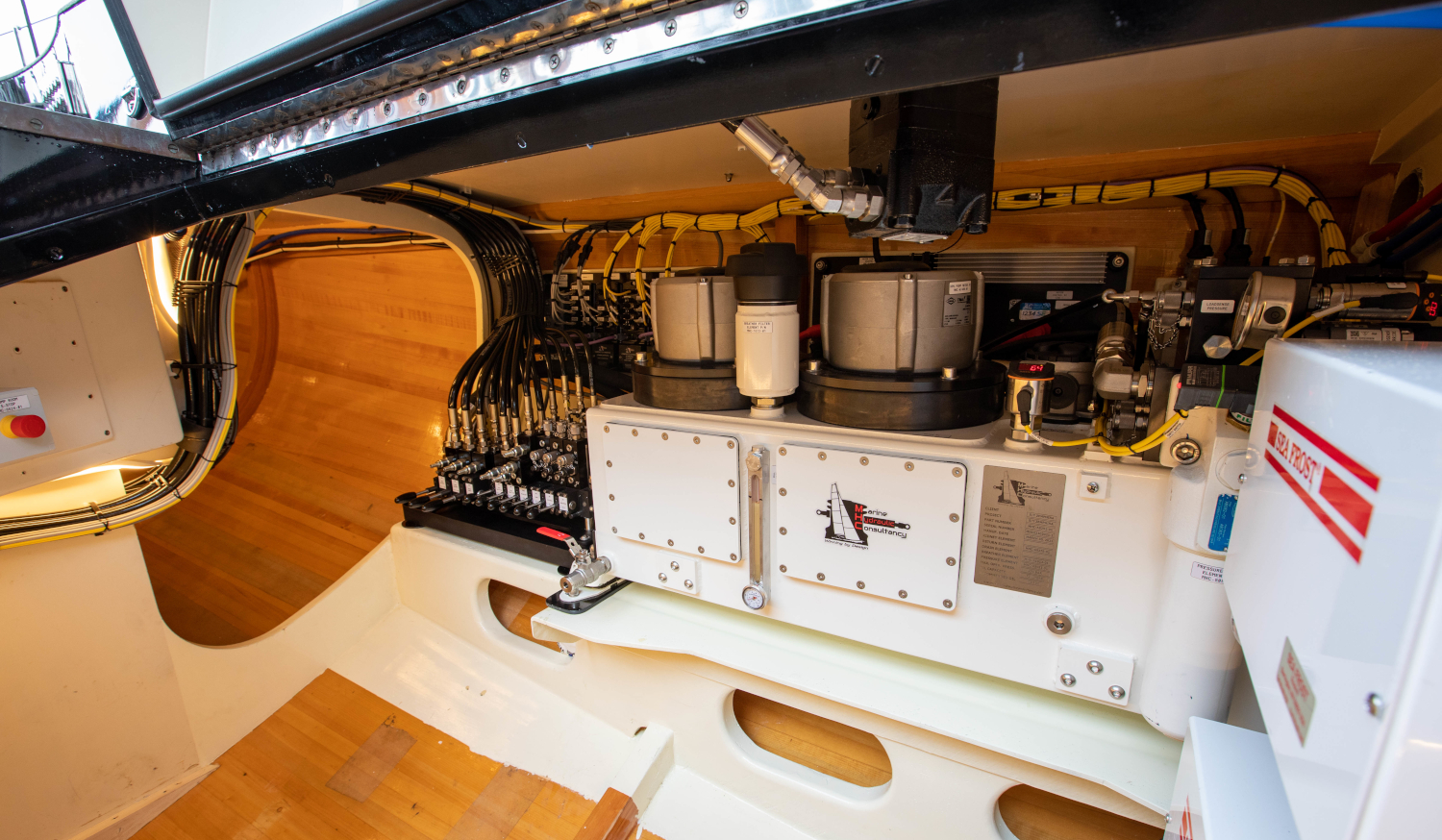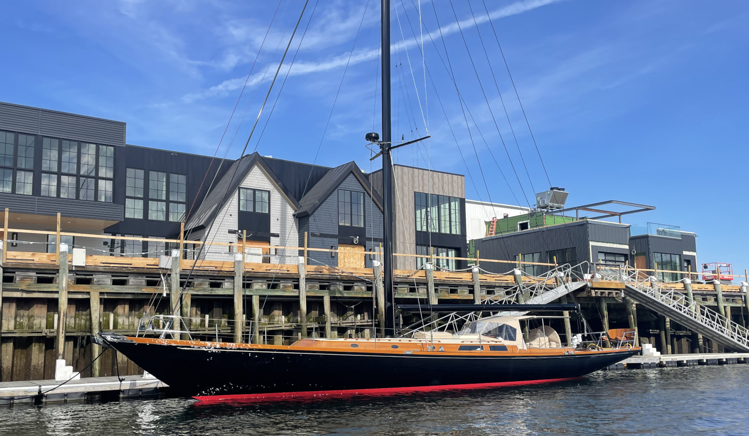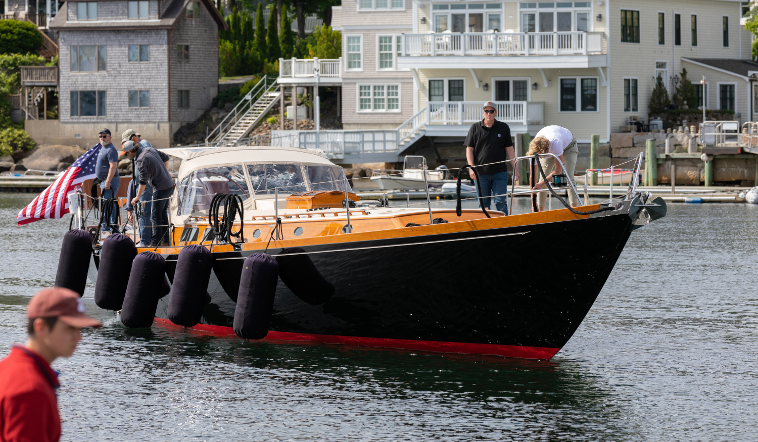 Much was accomplished over the winter of 2021. A below-deck hydraulic jib-roller furling system was designed and installed; the anchor roller and stem were modified; a carbon-fiber side-boarding platform and an enclosable dodger/bimini system were designed and built; new stern rails with owners’ seats of teak veneer over composite material added; refinements were made to the belowdecks saloon and sleeping staterooms. Lyman-Morse also undertook systems revisions, including a larger generator, a full hydraulic system to provide push-button sailing, new lithium batteries, and a full paint job in black. Plans for a low-resistance carbon-fiber keel were put on hold to finish in time for the 2021 summer sailing and racing season.