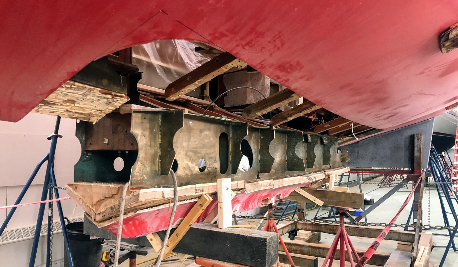 A new carbon hull replacement part and keel socket called for the old and heavy bronze grid work to be removed and replaced with carbon fiber grid work bonded to a new carbon fiber skin/socket and socketed keel. Mars Metal of Ontario, Canada, fabricated the new keel, a steel structural strut cast in place on a lead lower fin and large bulb. The new keel is the same draft as the original — 10’- 9”— but narrower longitudinally and skinnier in thickness, with a bigger bulb and about 1,000 pounds less overall weight.