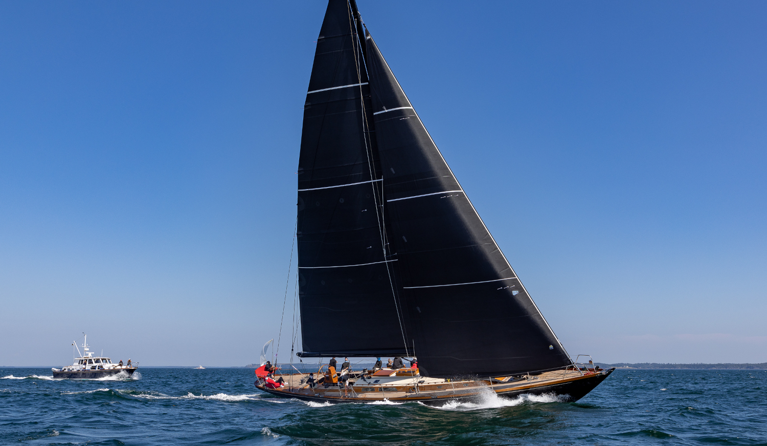 A favorite in the classic yacht racing world, the 76-foot wood/composite sloop was called Goshawk when built by Brooklin Boat Yard and Rockport Marine in 2005. The design brief by Bob Stephens and Paul Waring, then Brooklin’s in-house team, called for an ocean racer with a long, narrow hull and classic overhangs, a deep fin keel with bulb and a spade rudder. The stiletto-like sailboat was sleek and easy to maneuver, with speed and power to spare.