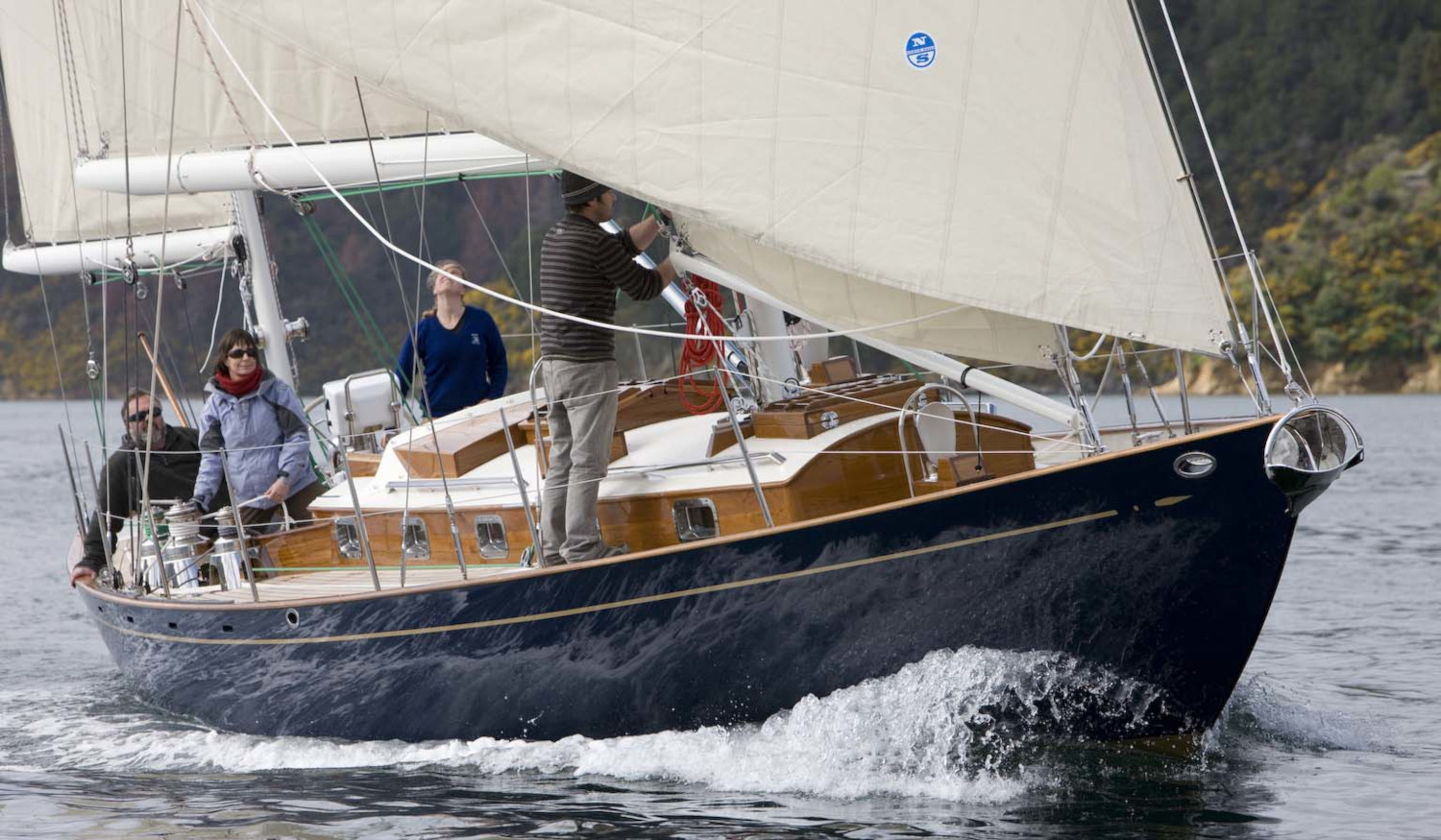 - Combined strip planked and Epoxy glued cold-molded Kauri Pine (3 layers) with three outer layer hull laminates.
