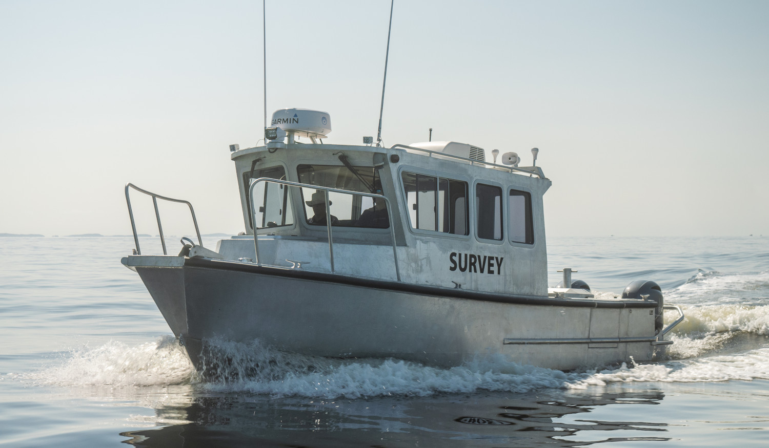 Life on the coast of Maine can be challenging – rough seas, rugged shoreline, extreme weather. Our vessels are built to withstand everything mother nature can throw at us. When the USGS came to us looking for a survey vessel for their Woods Hole operations, our fabrication division was up to the task, and delivered a vessel built to handle the agency’s important and challenging work. This 26’ aluminum vessel was launched this summer as part of our growing fleet of workboats. Powered by Twin Yamaha 200HP outboards and includes a generator to power the A/C unit and several computers.