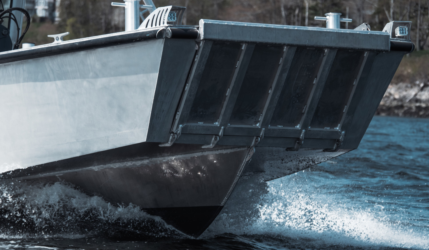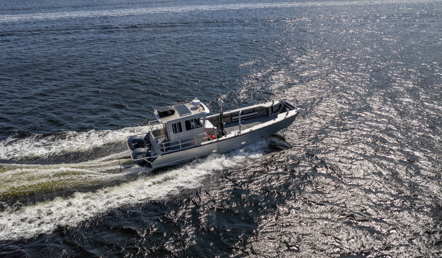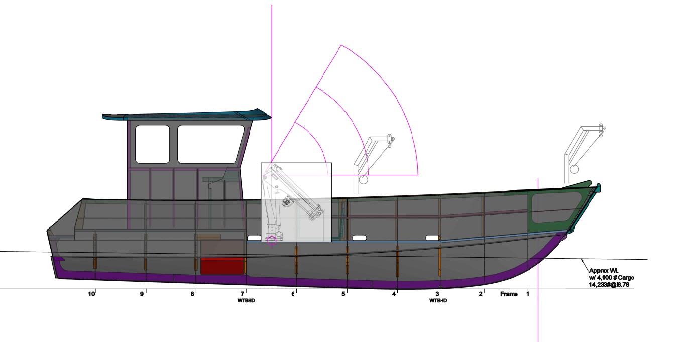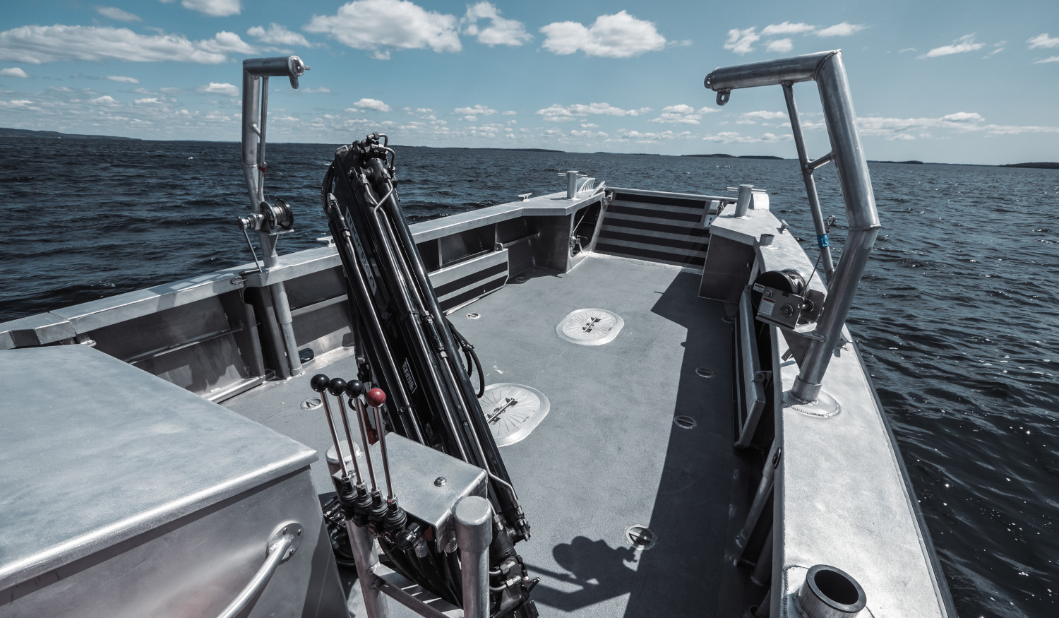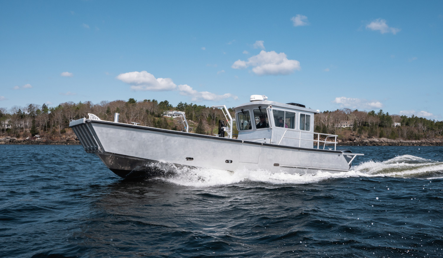 The LMF 33 Landing Craft was designed with commercial use in mind. The aluminum hull allows for operators to land the boat on rocky beaches without worrying about damaging the hull, while the wide open bow acts as the perfect work space. Hull No.1 was built for the University of New Hampshire’s aquaculture research program which required a 3300lb crane to be mounted on the deck for easy hauling of nets/traps.